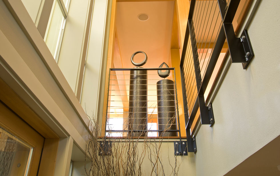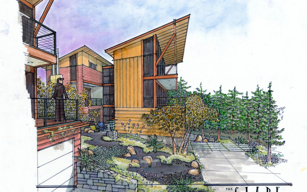 Three houses include a lower-level accessible apartment with a dedicated kitchen, bedroom, and bathroom. All levels center on glass atria with views of the site landscaping and courtyards. The houses face west to entry bridges spanning the streams and pools below and east to covered decks and Seattle views. The Glade uses natural and sustainable materials and finishes to complement Northwest contemporary forms and textures.